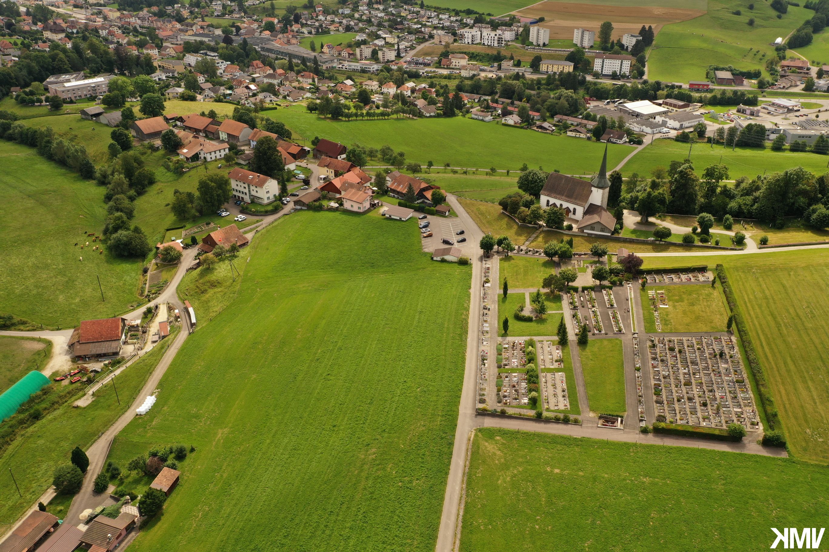 Le hameau de Chaindon (commune de Reconvilier) avec son Eglise réformée (reconstruite entre 1739 et 1740) et son cimetière.