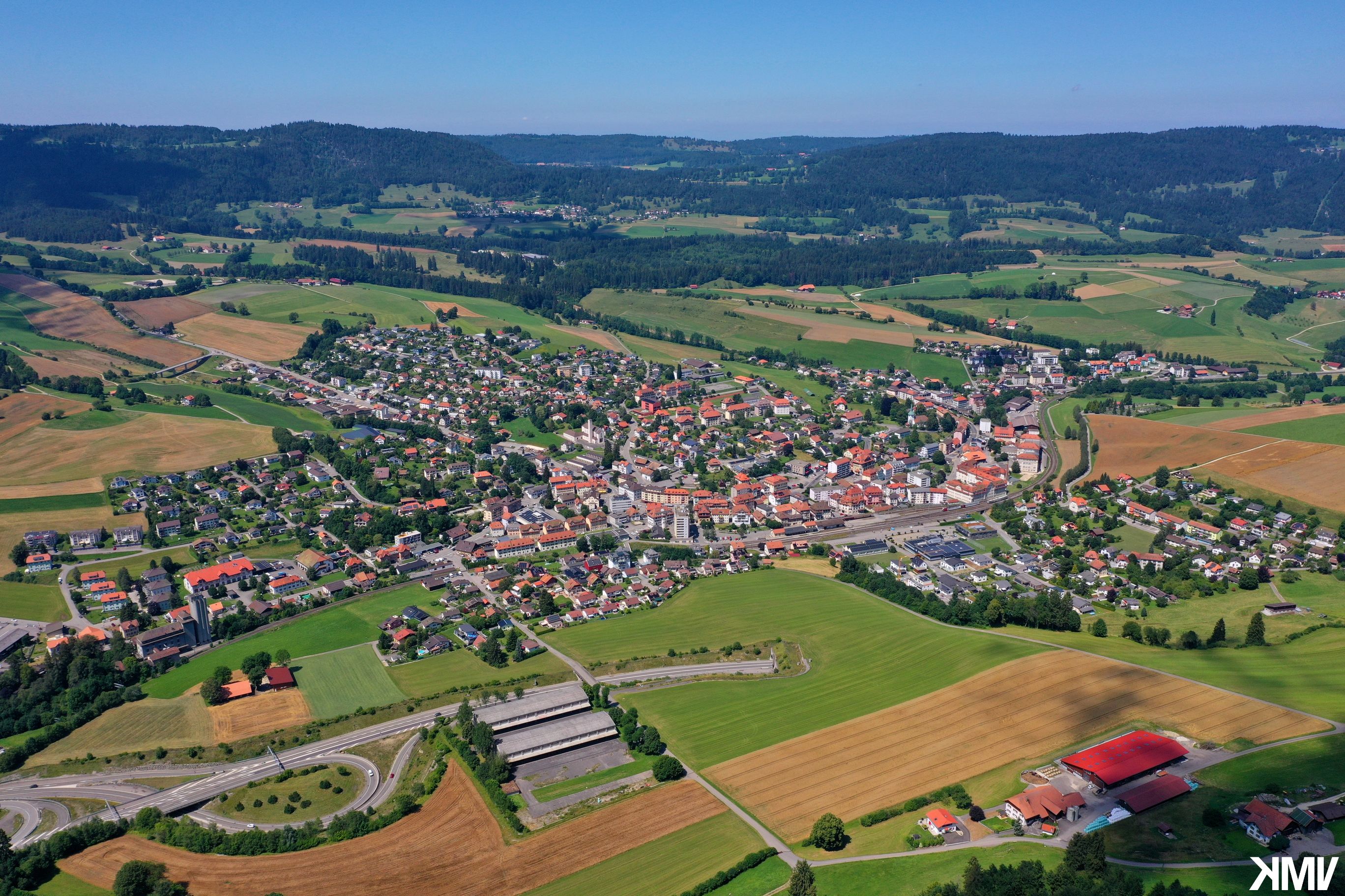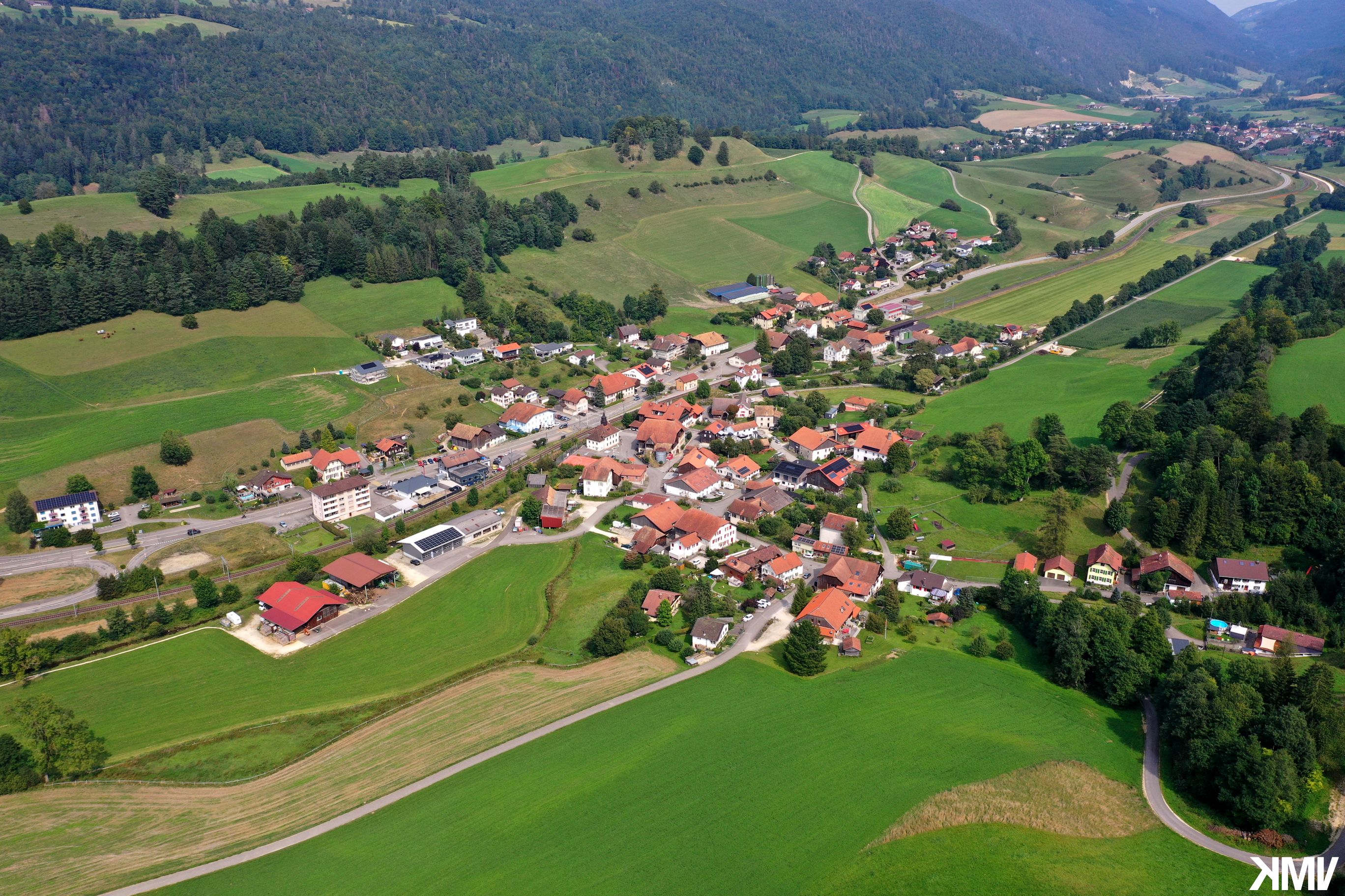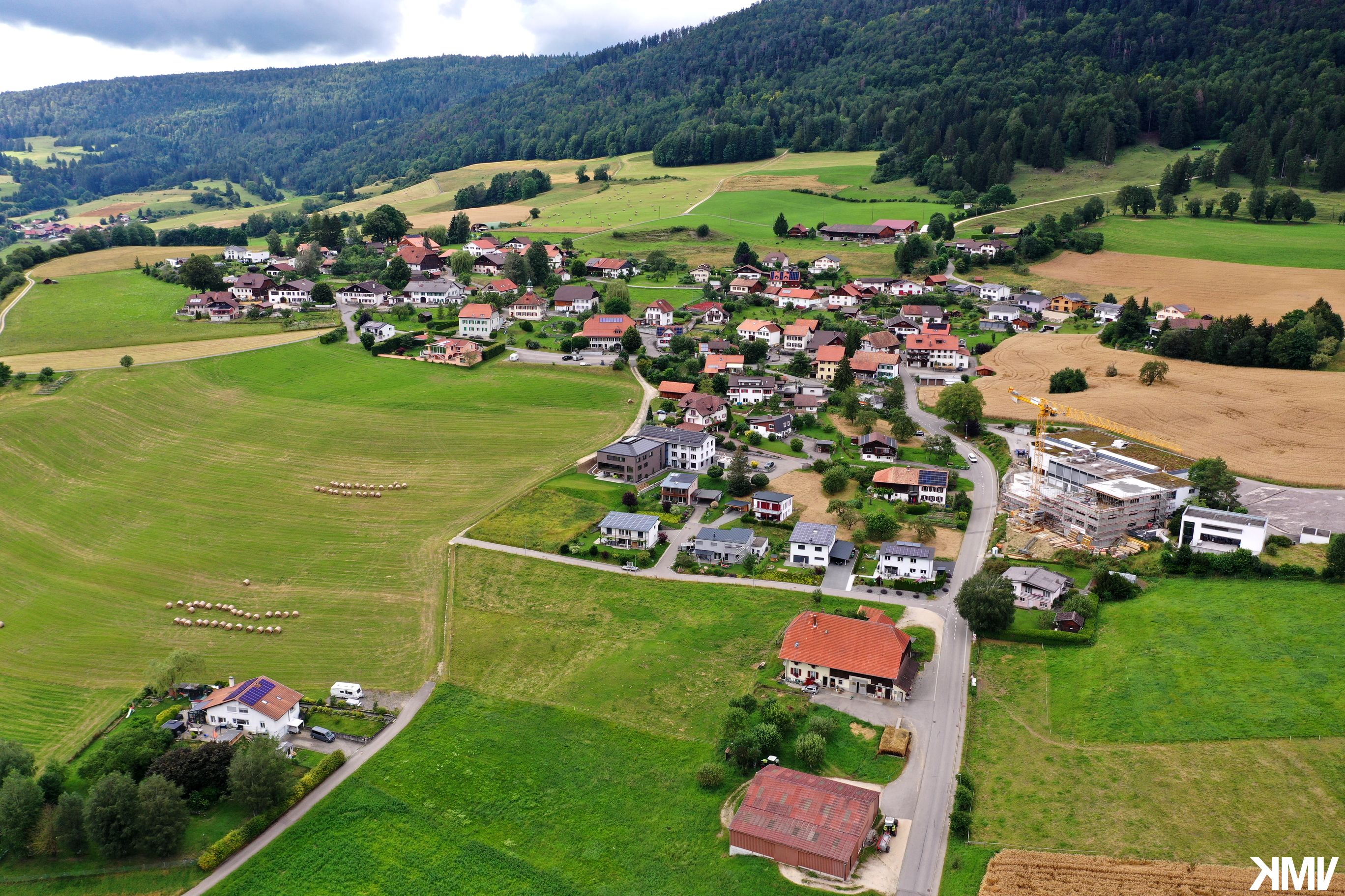 La localité de Malleray vue depuis la place de sport Champ-Martin.