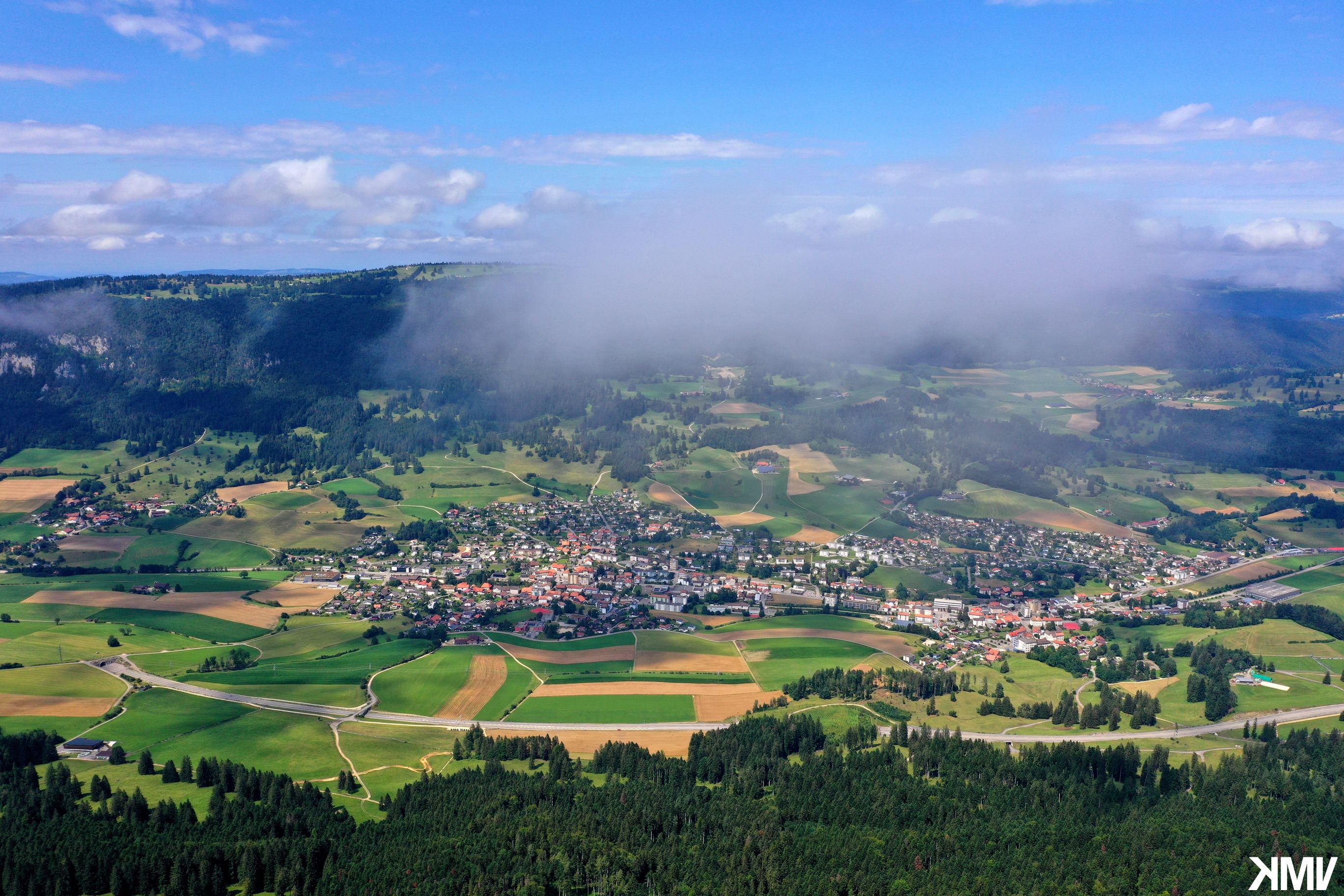 La commune de Valbirse (Pontenet, Malleray et Bévilard) depuis le sommet du Montoz. Un nuage de basse altitude s'est invité dans le cadre.